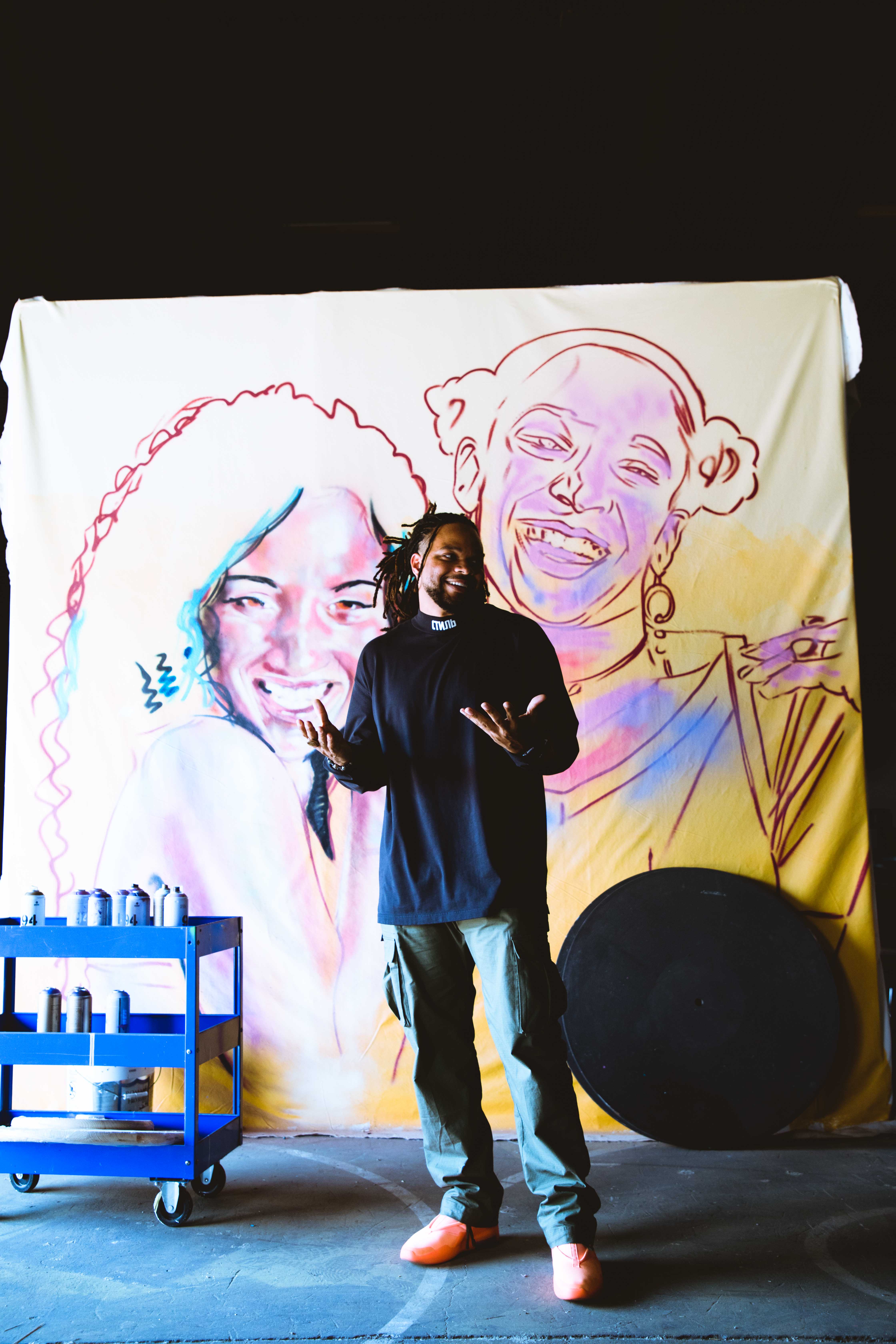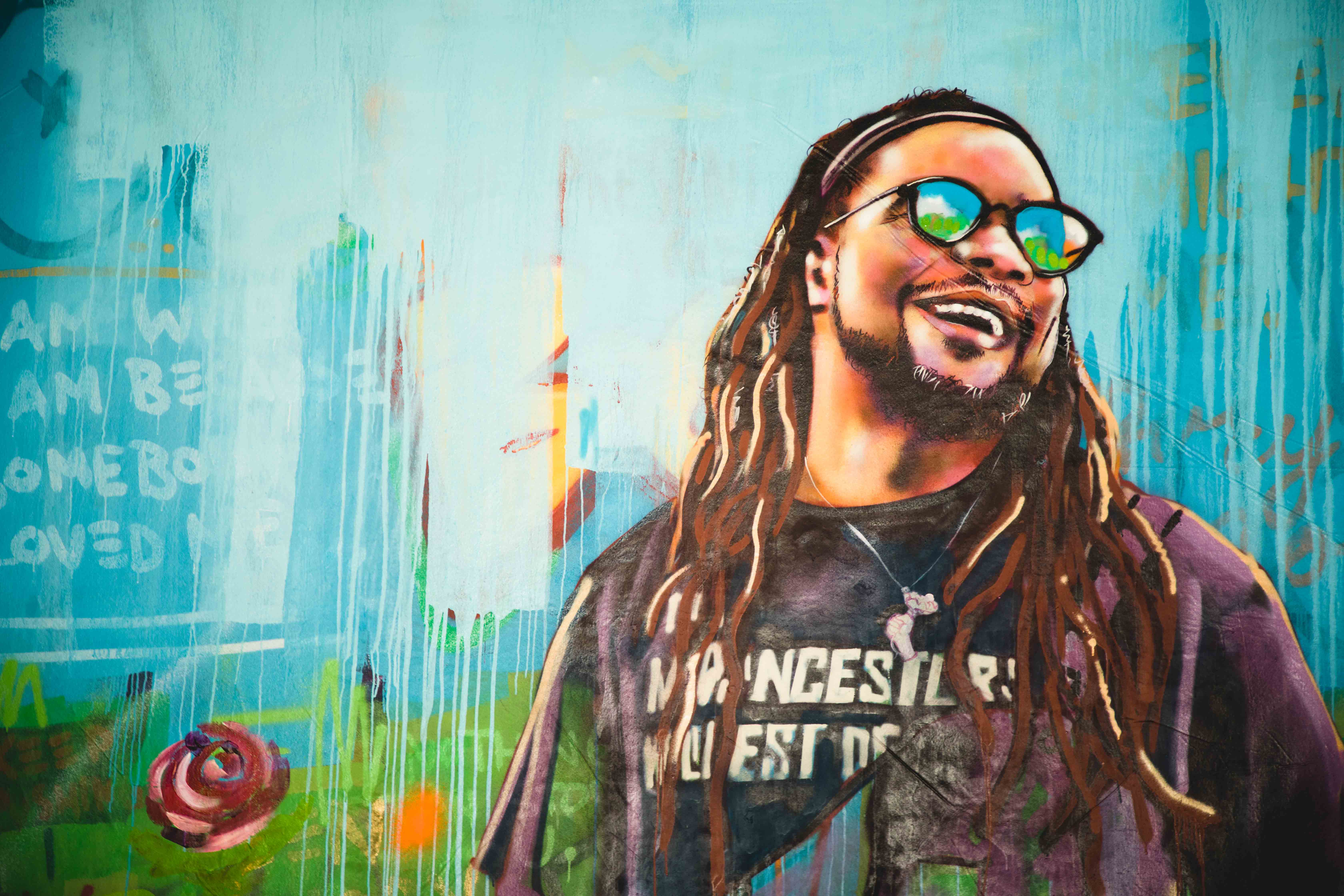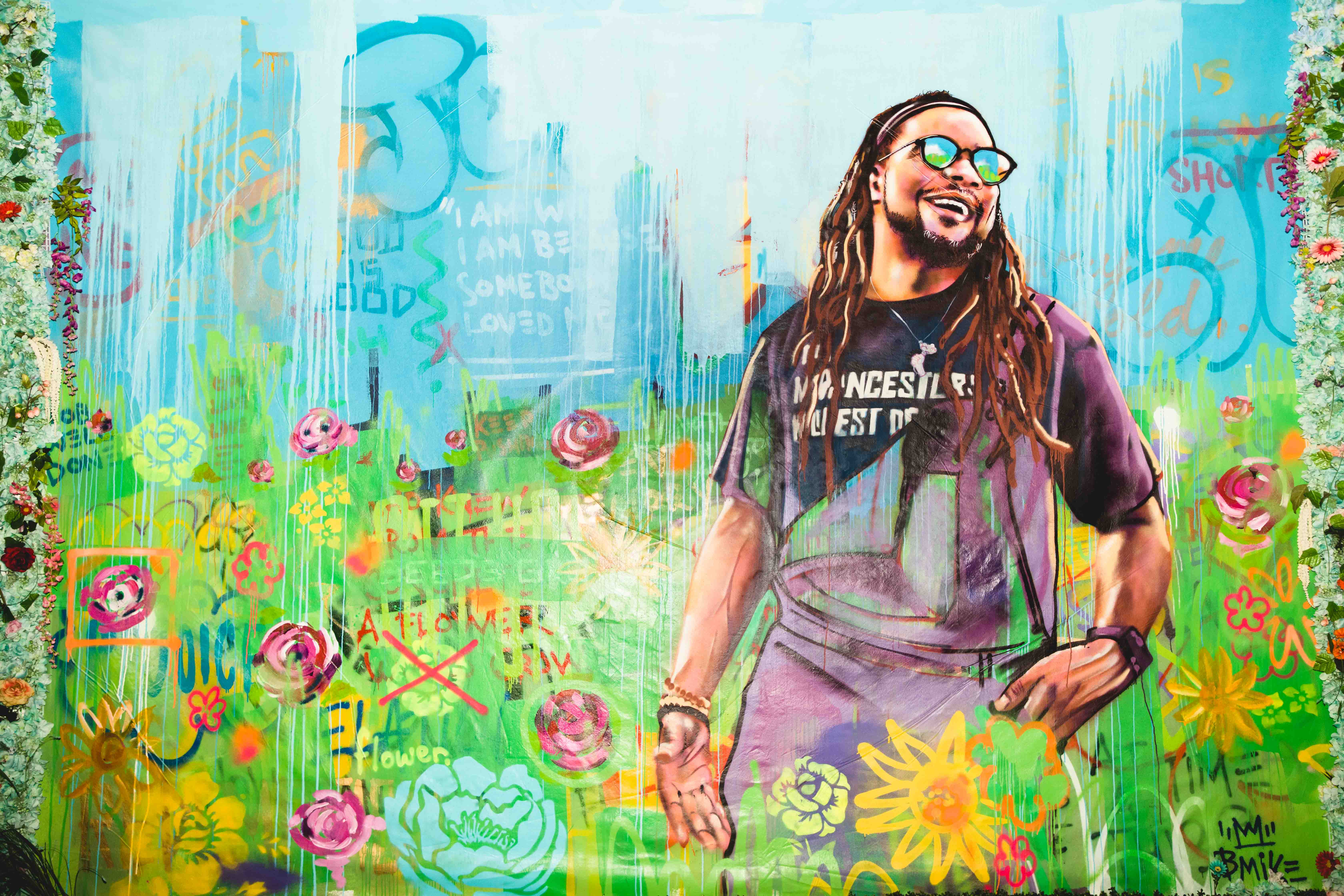 “New Orleans is a place where you can just fall into art,” says Brandan “Bmike” Odums. “You can find it anywhere, without a cost of admission.” We’re sitting in his office at Studio BE, the 35,000 square-foot Bywater warehouse space he’s turned into a center for his activism-through-art. In addition to housing his sprawling “Ephemeral.Eternal” exhibit, the building is the central nervous system of a globally recognized movement including educational programs, panel discussions, film, merchandise and more. A massive yellow exterior wall adorned with a young, haloed Black girl with hands outstretched greets visitors.